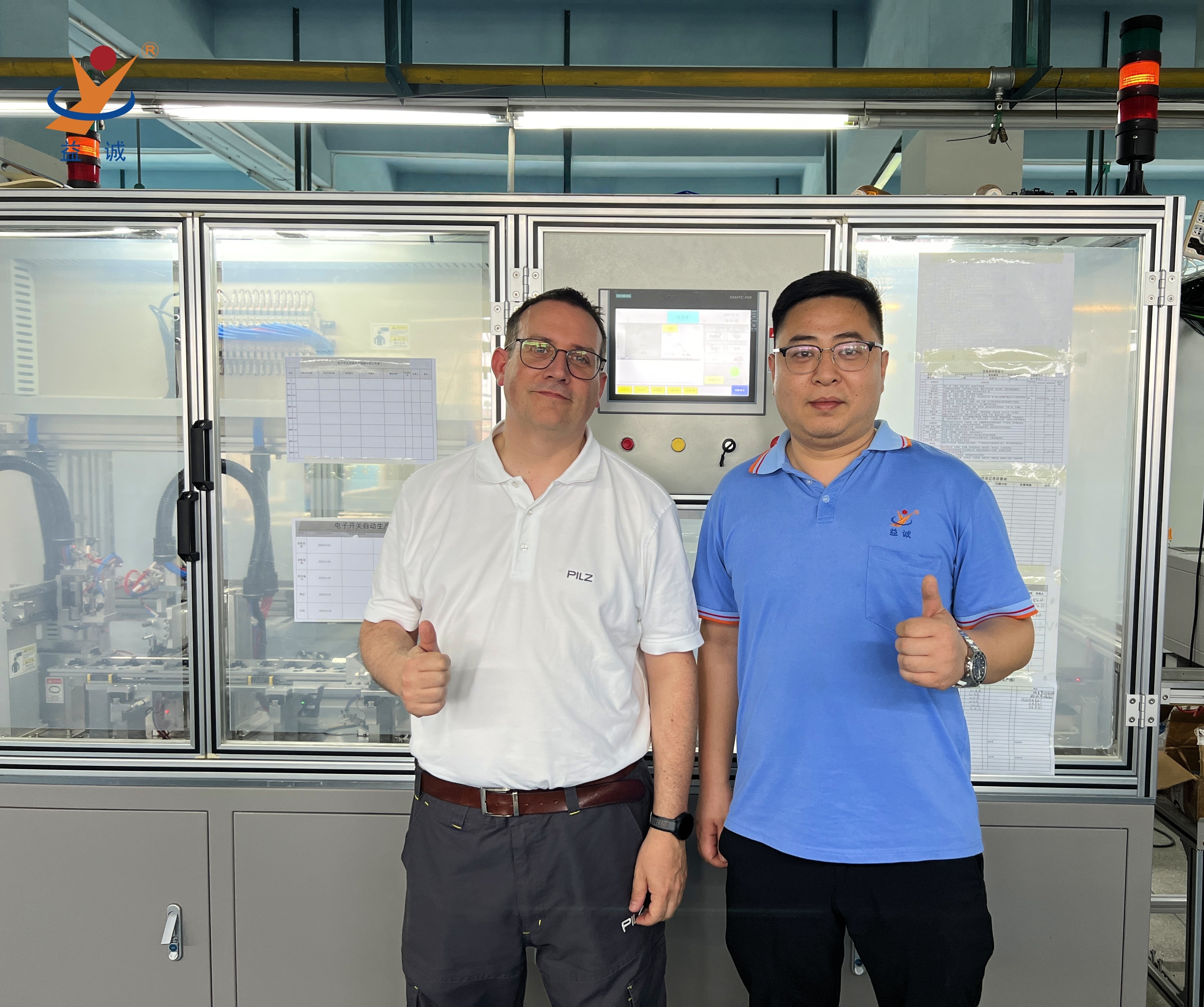 来自法国的客户团队正在现场对高端智能低压电器自动化生产线进行细致地验收,该种类设备是九州酷游的实力产品之一,是集合高智能、高精度、高产能与实时数据化检测系统等高端技术于一体的高科技自动化生产线。